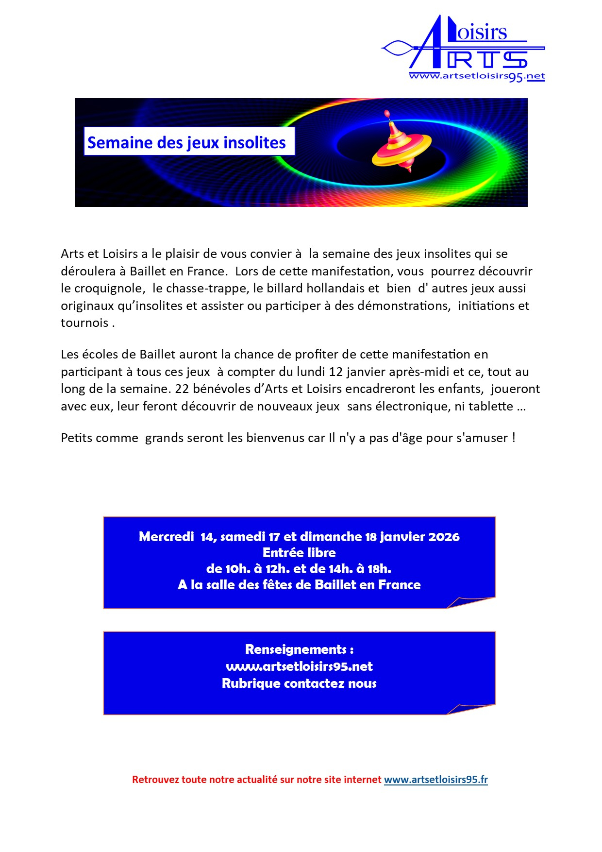 Du 12 au 18 janvier 2026 Salle des fêtes de Baillet Continue Reading Précédent Soirée CountrySuivant Les Ateliers Créatifs