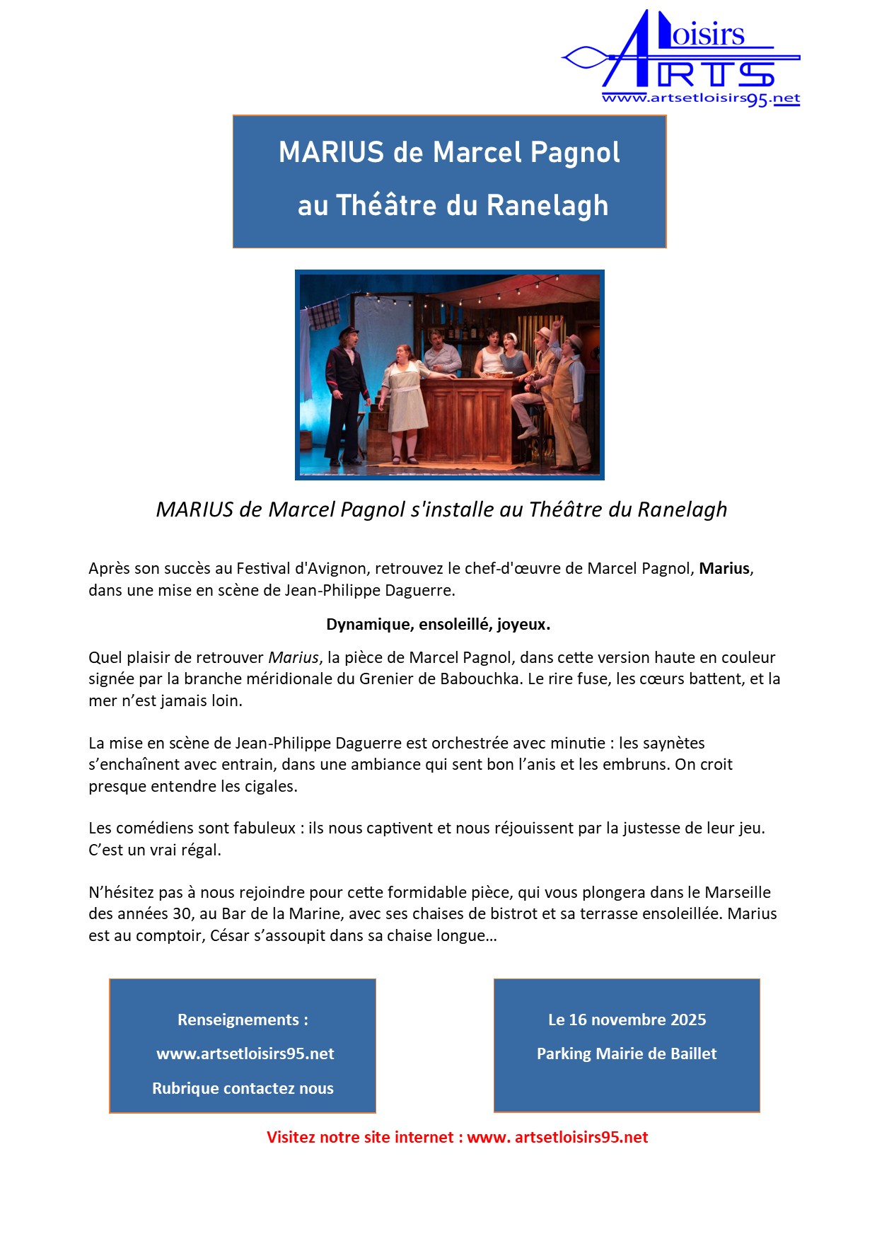 Accueil Events Théatre MARIUS de Marcel Pagnol au Théâtre du Ranelagh Date de l'événement 16 Nov 2025 Horaire 0 h 00 min - 0 h 00 min MARIUS de Marcel Pagnol au Théâtre du Ranelagh Partager cet événement Ajouter au calendrier Google Exporter iCal ou Outlook